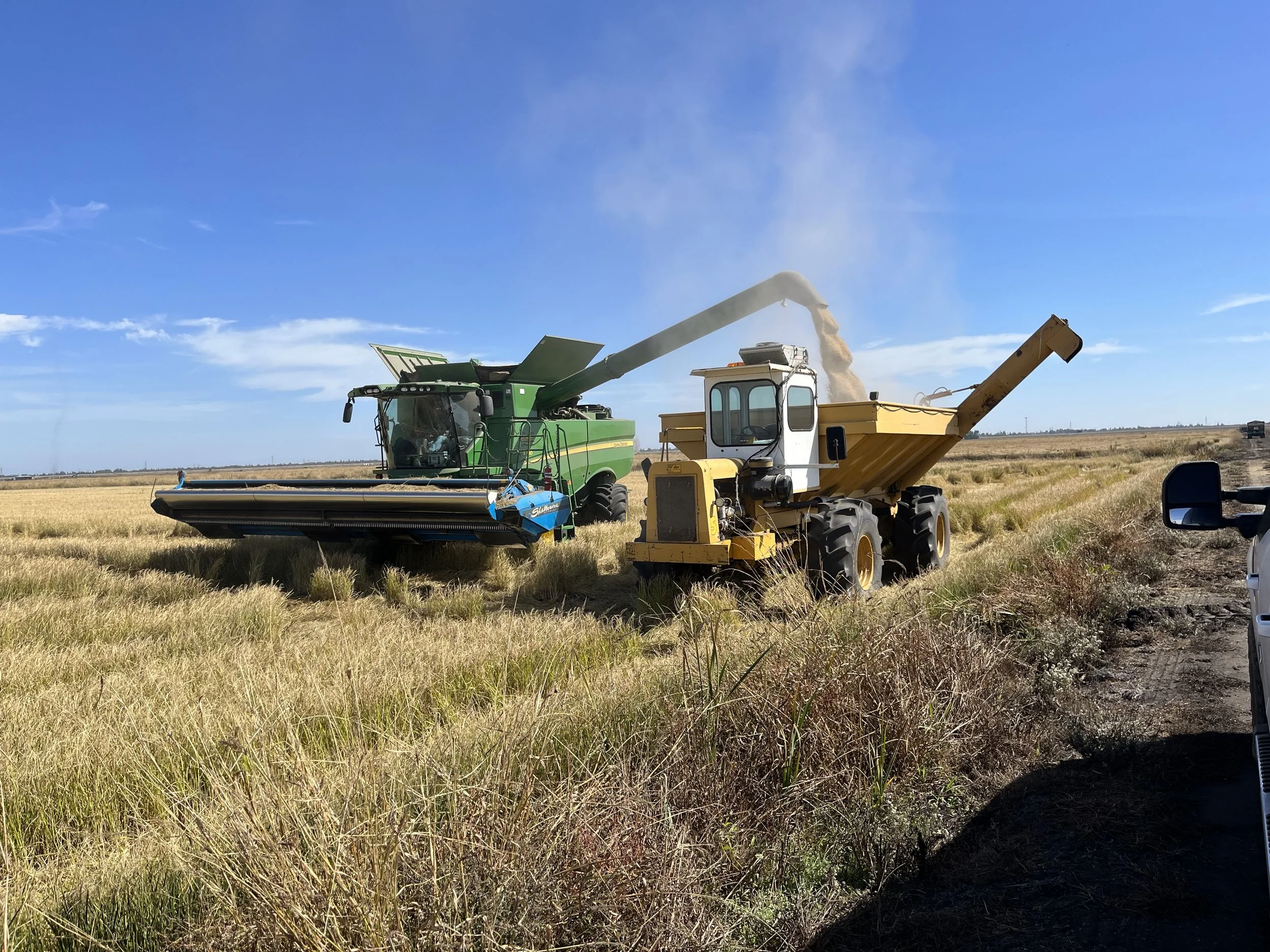 B&B Harvesting is a family-owned business that was established in Modesto, CA in 1947. We currently operate John Deere 9770 and John Deere s670 combines with various headers that allow us to harvest a wide variety of crops including wheat, barley, oats, safflower, corn, and rice. We also run self-propelled bankouts that shuttle the grain from the combine to the trucks waiting at the field. These bankouts unload the combine on the go, allowing the combine to continuously harvest. Our commitment to excellence, sustainability, and personalized service, enables us to provide top-quality harvesting solutions tailored to the unique needs of each Farmer and field.